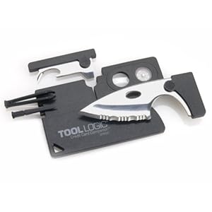 The Tool Logic Credit Card Companion is a multifunction tool card with ten features. It feautes a 2-inch Inch serrated blade and precision folding scissors. It also has an 8-time magnifying power lens and compass. It is a combination can/bottle opener/awl and has a Flat screwdriver, tweezers and toothpick. The tool card is ultra-light at just 1.3-ounces.